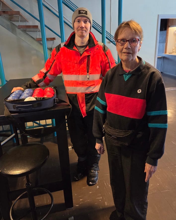 Liikuntapalveluvastaava Niko Nevala luovutti Koski Tl kunnan puolesta uudet pelipallot Boccia kerhon ohjaajalle Pirkko Pursimolle.
