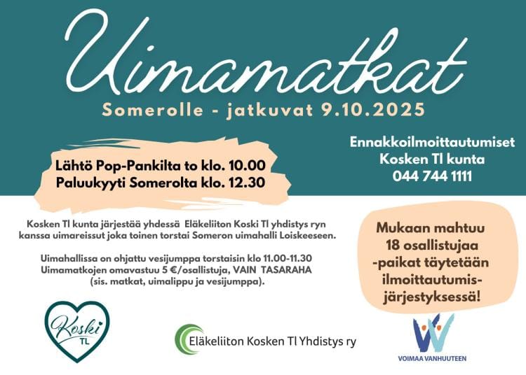 Kosken Tl kunta järjestää yhdessä Eläkeliiton Koski Tl yhdistys ry:n kanssa uintireissut joka toinen torstai Someron uimahalli Loiskeeseen.